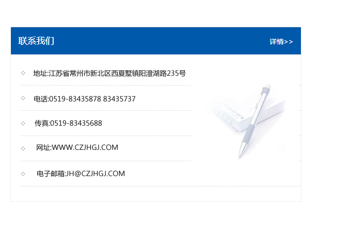 地址:常州市新北區友邦商務大廈1幢16、17層  電話:0519-85101652  傳真:0519-85112595  郵編:213022  網址:www.cz-jiayue_cn.hui-lian.com  郵箱:xiajifengaa@163.com
